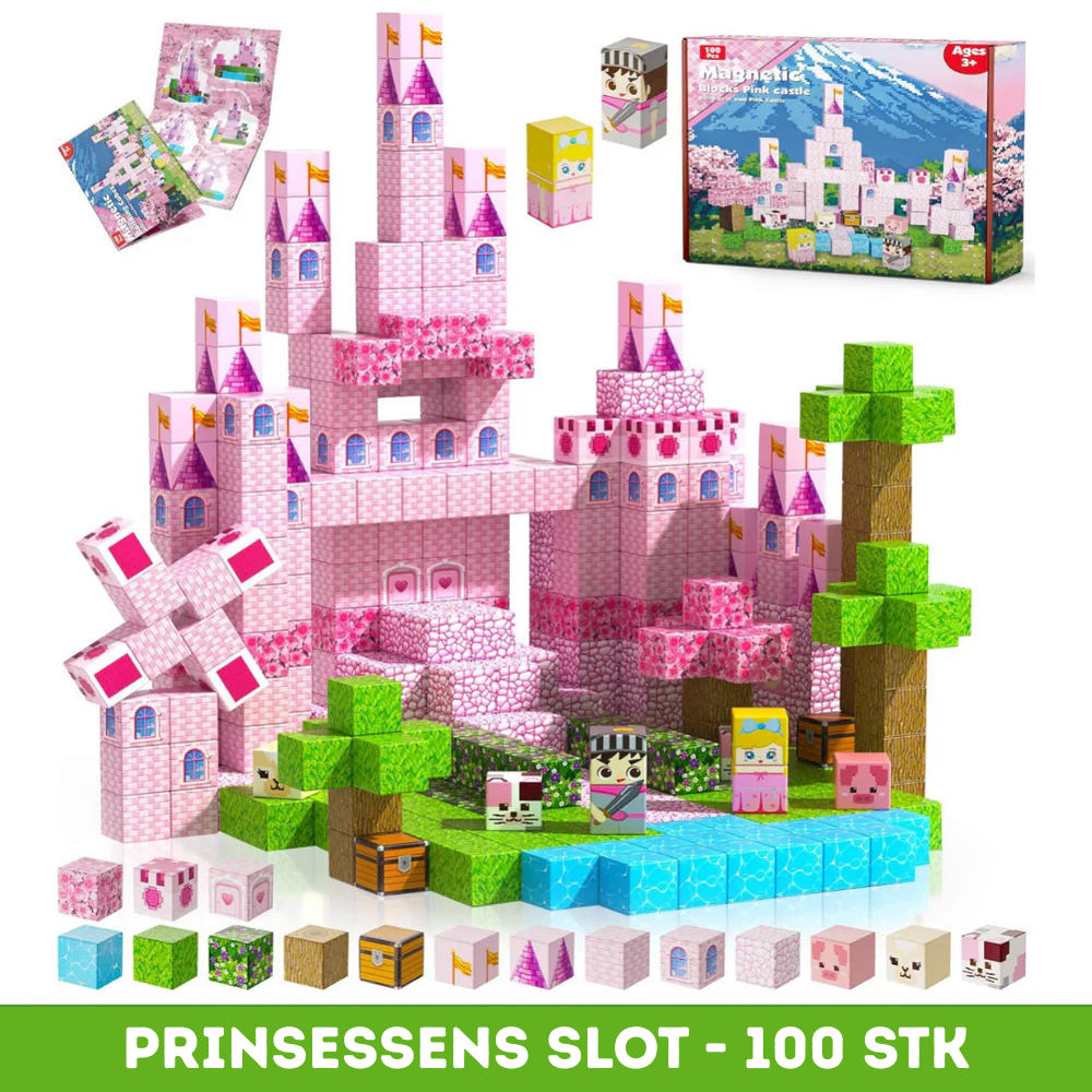 Med de magnetiske klodser kan dit barn bygge et eventyrligt lyserødt slot med tårne, sale og magiske detaljer.